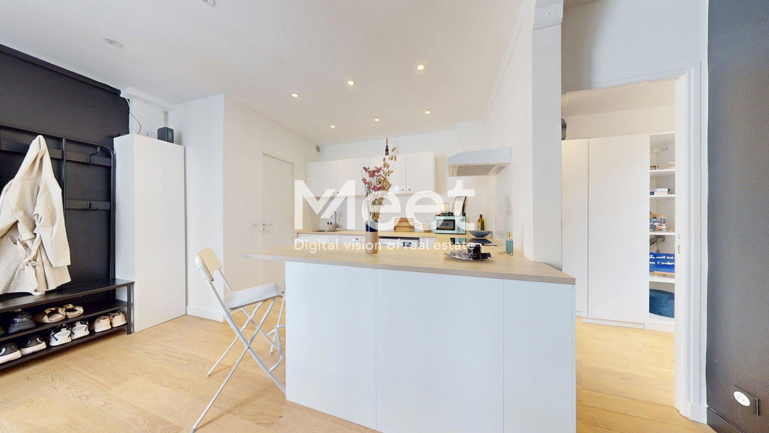 - Entrée sur la pièce de vie aménagée avec cuisine ouverte, rangements, espace salon d'une surface d'environ 18m2.