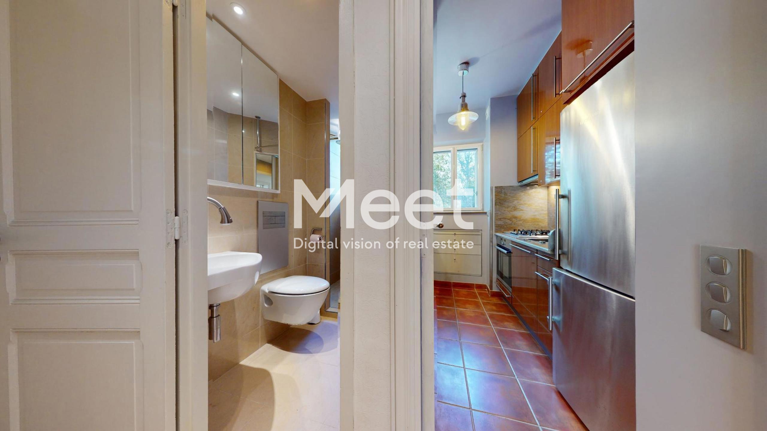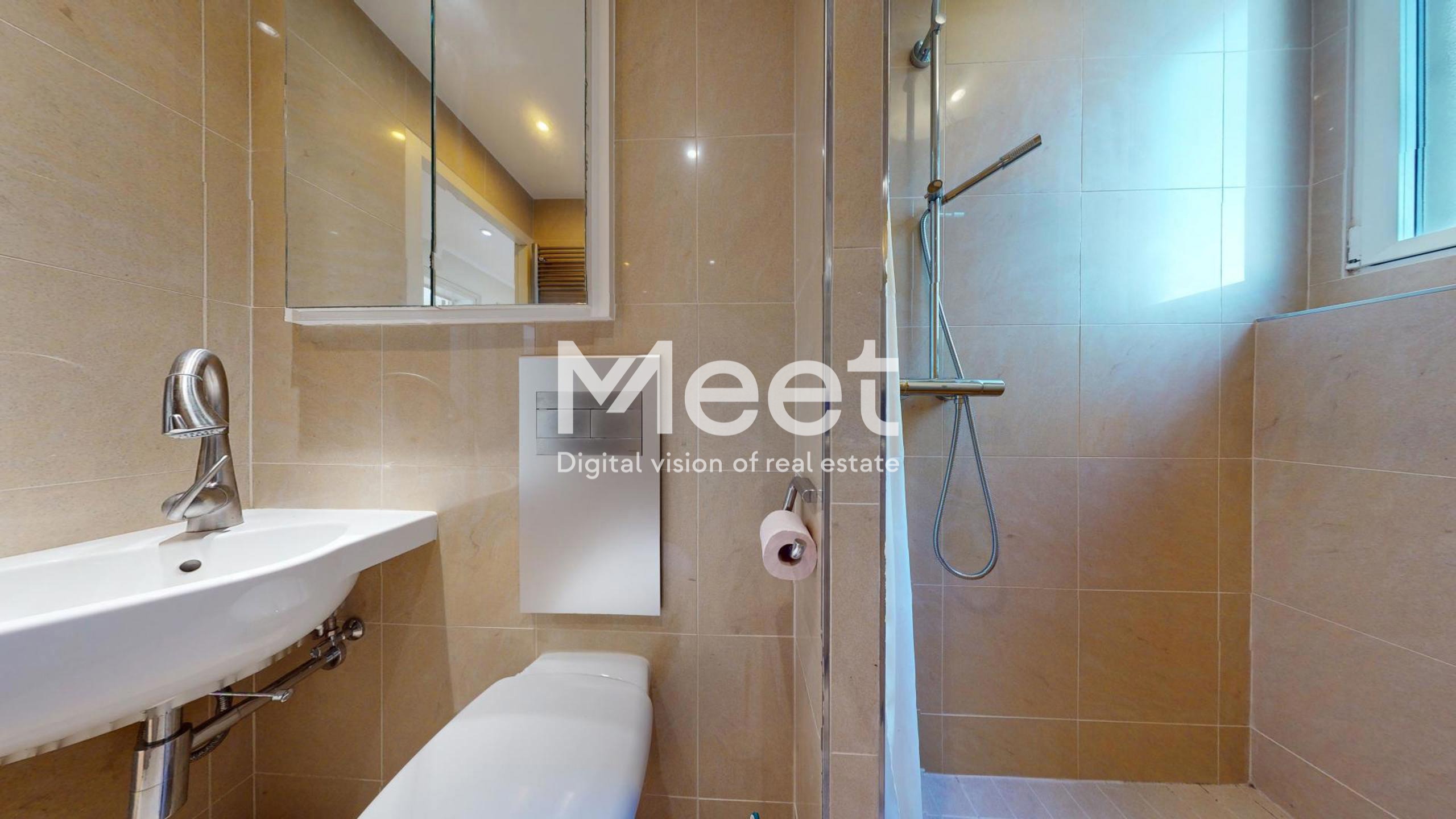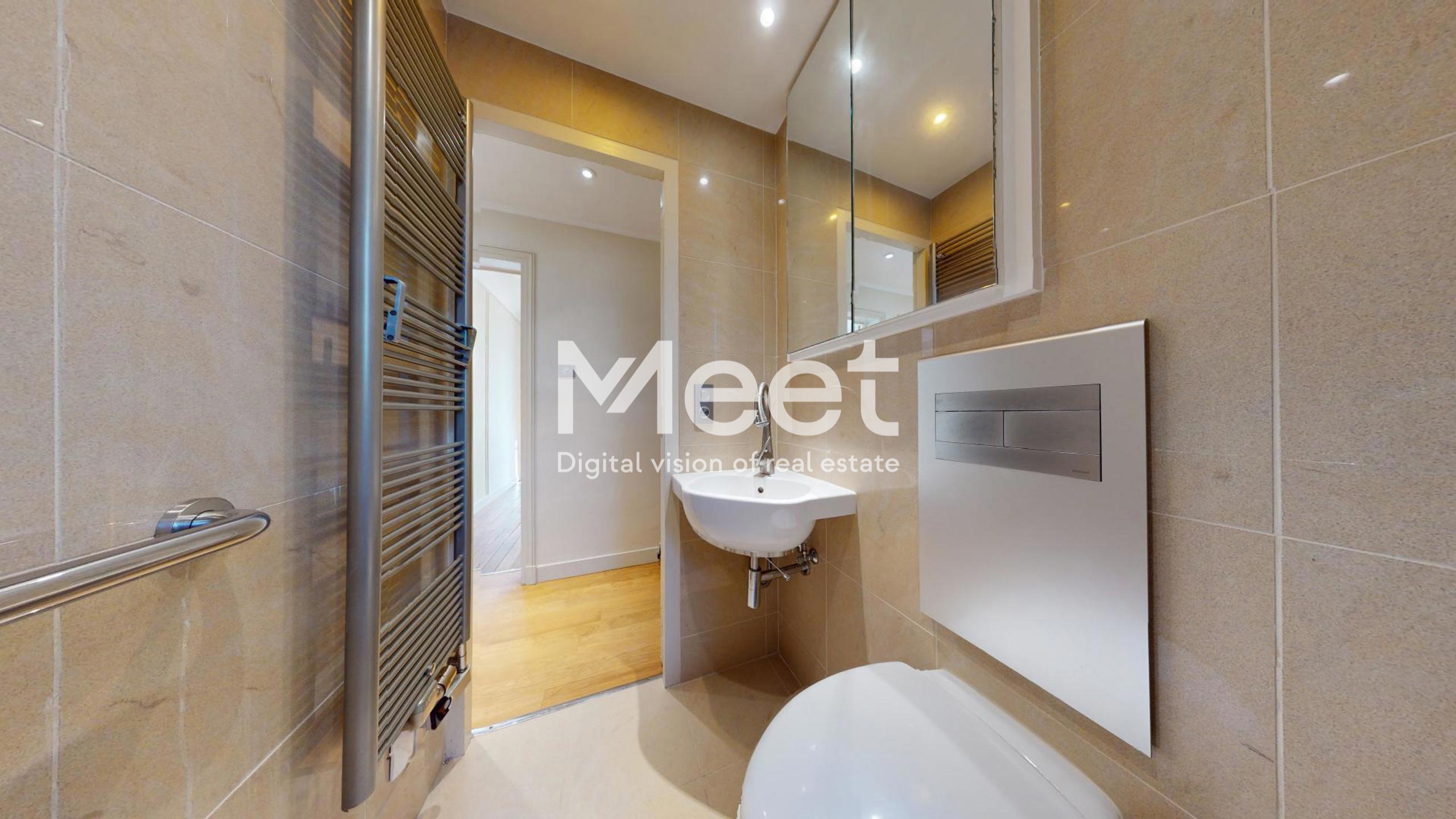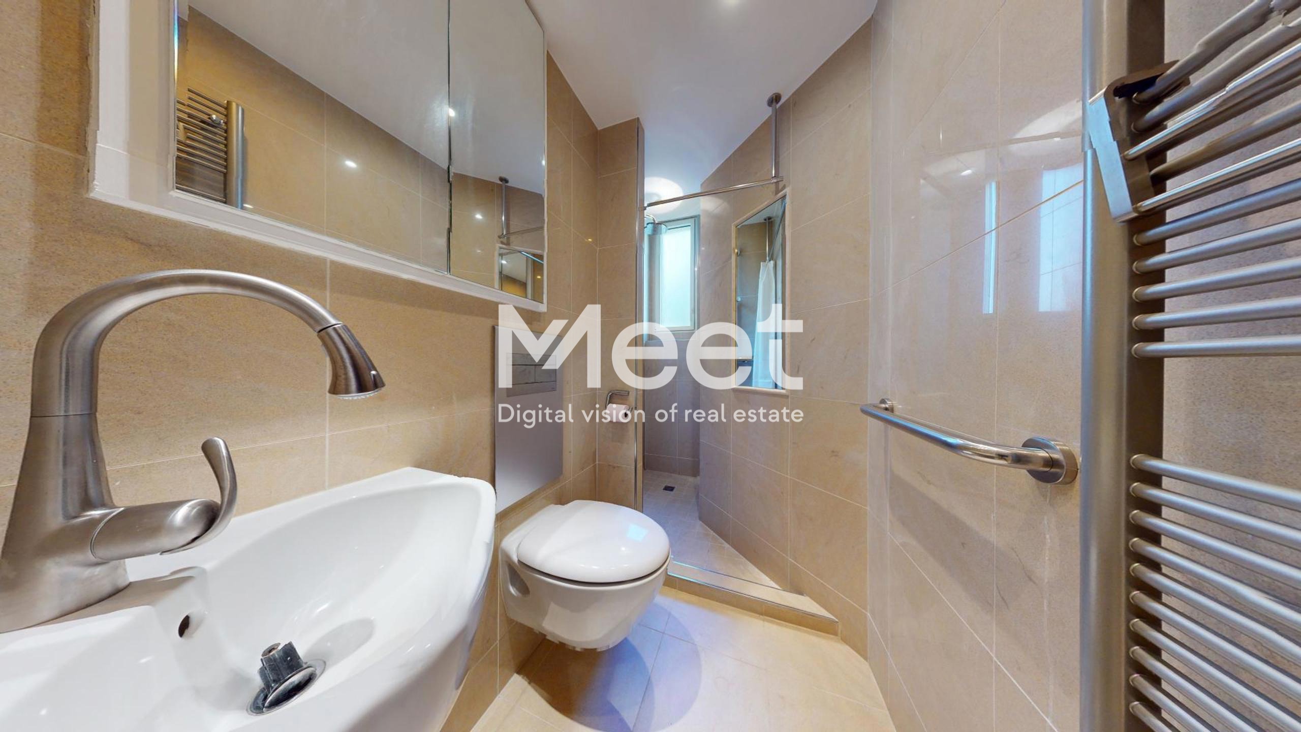 - Une salle de douche en Grès Cérame Pietra de Tunisie / WC avec un espace optimisé et un sèche-serviette mural chauffant.