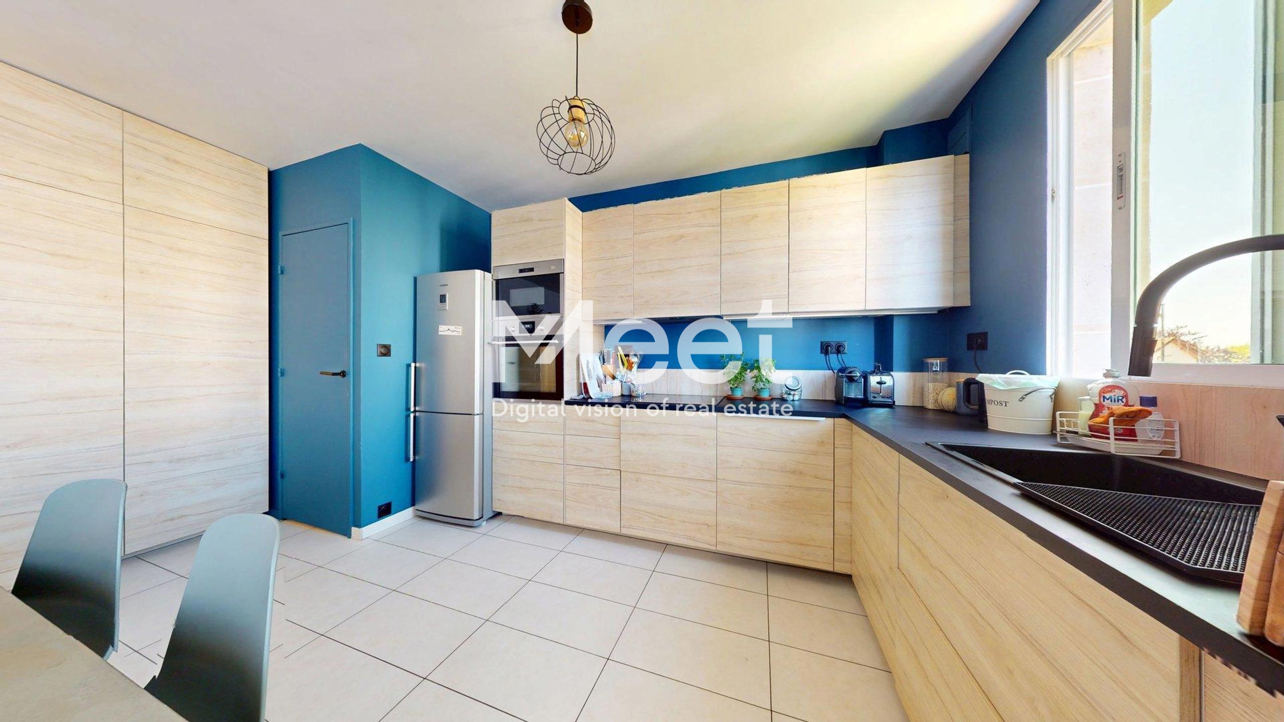 La cuisine, dans un esprit convivial et contemporain, s’ouvre sur le salon et la salle à manger, offrant un espace propice aux échanges familiaux ou entre amis.