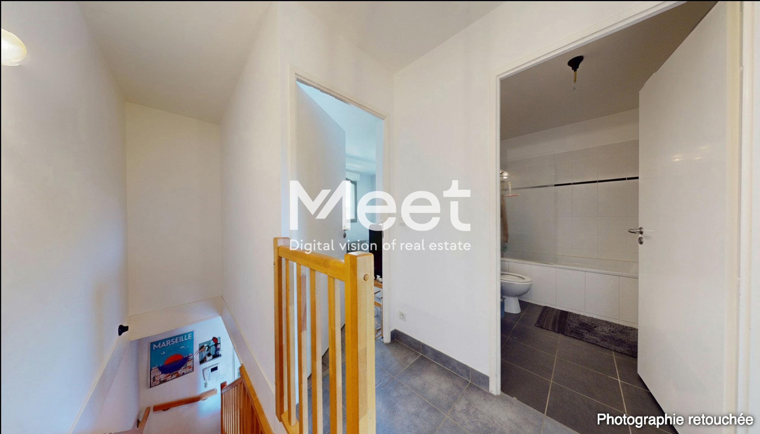 L’appartement s’ouvre sur une entrée desservant un séjour avec cuisine aménagée et ouverte, prolongé par un balcon exposé plein sud. À l’étage, l’espace nuit comprend deux chambres. Le logement dispose d’une salle d’eau avec WC au niveau principal et d’une salle de bains avec WC à l’étage.