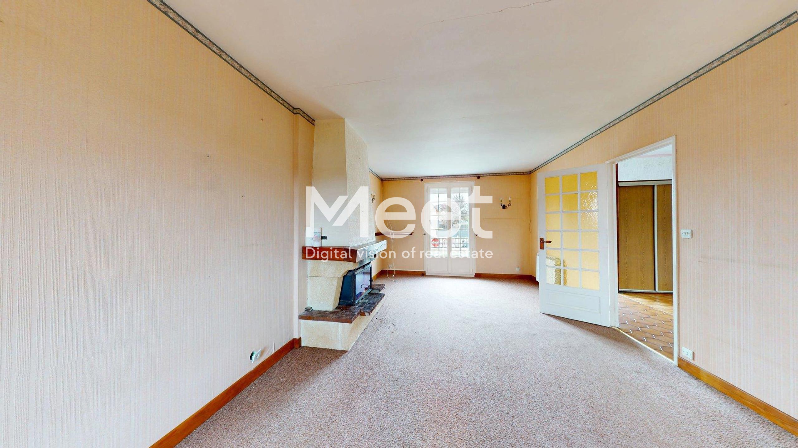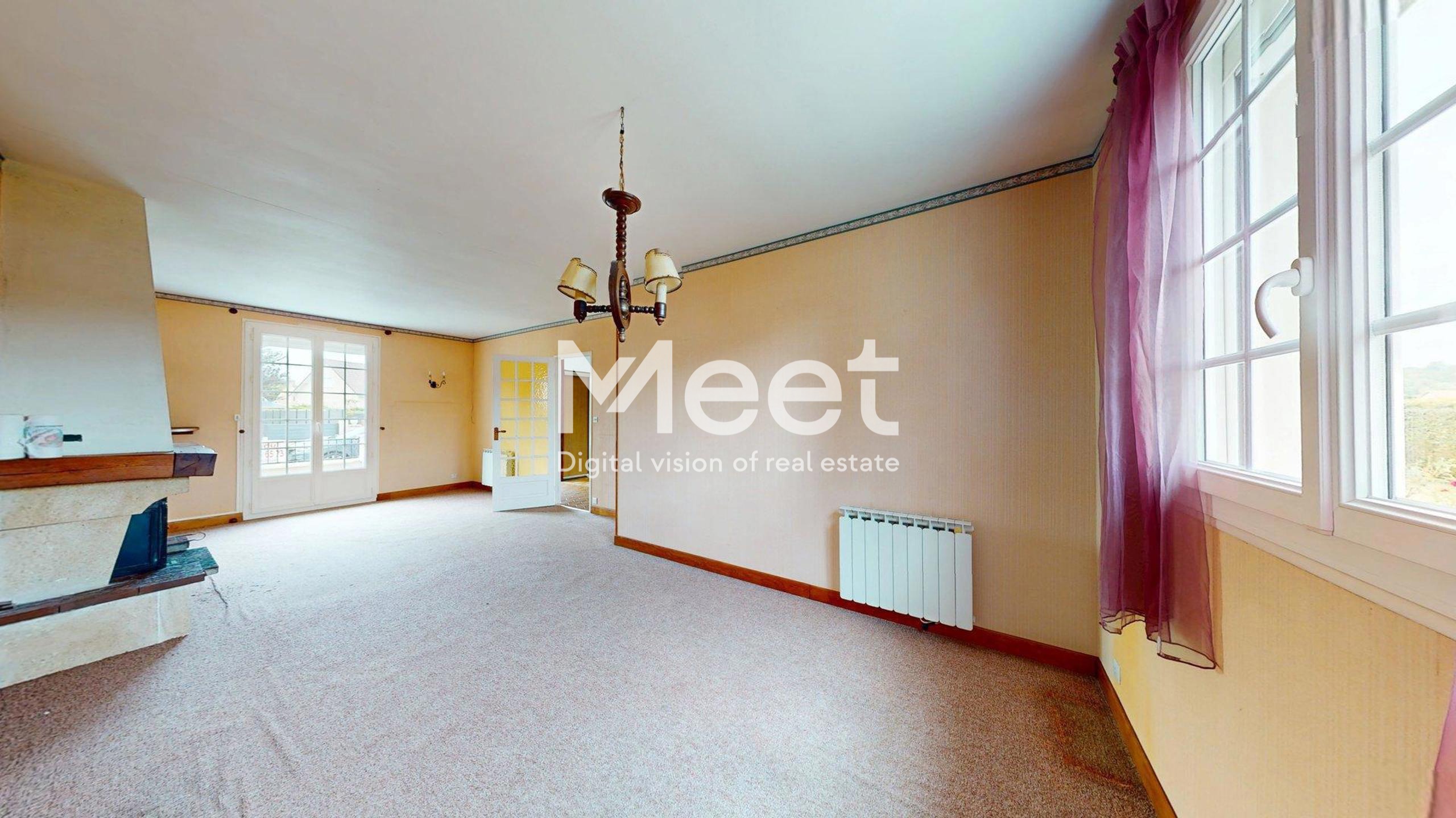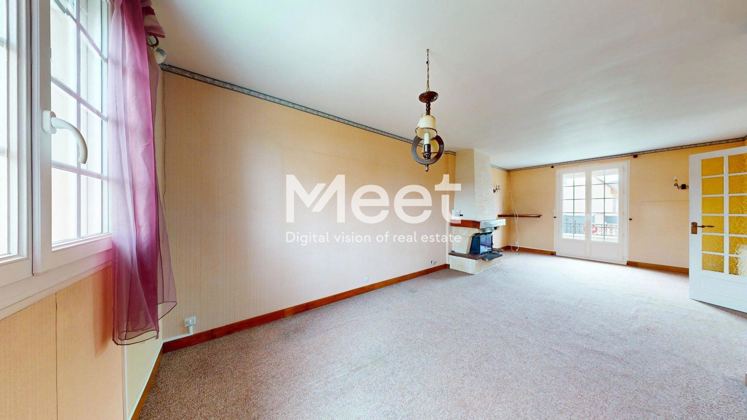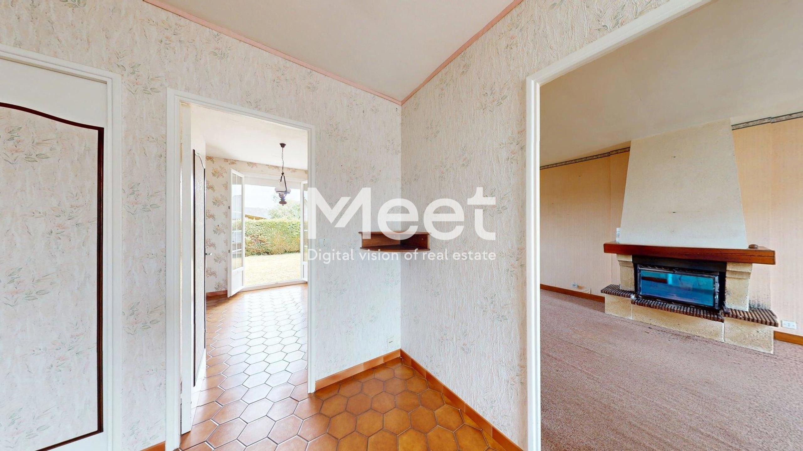 Un séjour lumineux complété d’une cheminée avec insert à bois, parfait pour créer une ambiance chaleureuse.