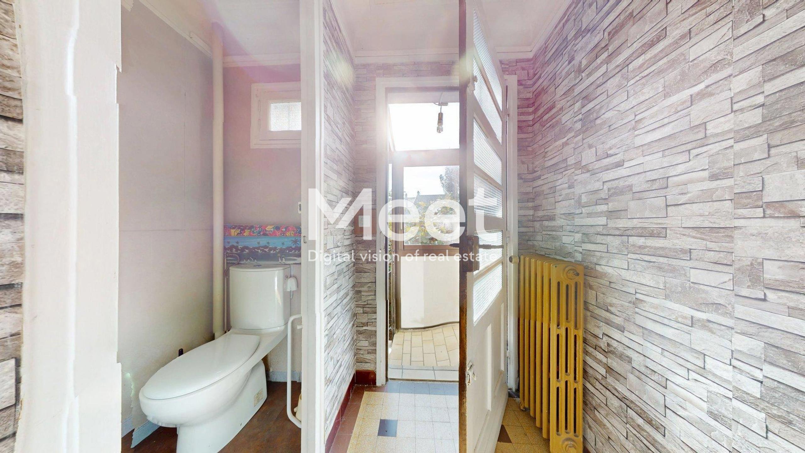 À l’entrée un séjour/salle à manger, et une cuisine ouverte au séjour. Toilettes séparées.